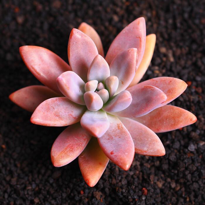 叶片扁平,卵形,顶端有小尖,灰绿至灰褐色,呈莲座状密集排列。花五星状,5瓣,深粉红色。