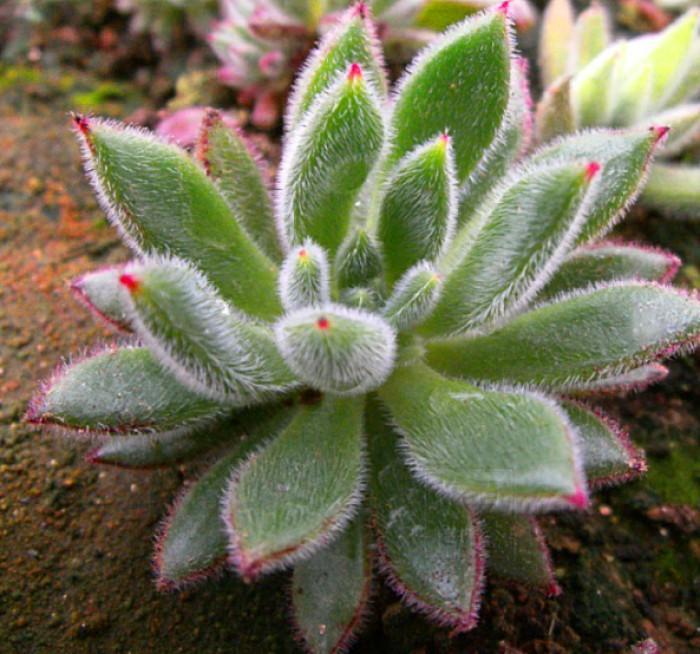 叶片肥厚,灰绿色卵状,叶端及上缘呈红色,上面布满了细短的白色绒毛。