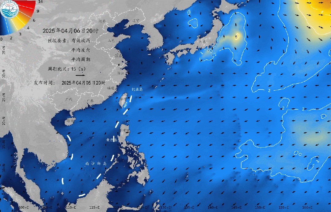 南海中部、南部有1.1到1.4米的轻浪到中浪;