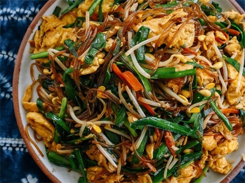 它非常的质朴又丰盛,有很多食材结合在一起,例如鸡蛋、韭菜、胡萝卜、豆芽、肉丝、红薯粉丝等,味道咸鲜平衡,堪称完美!