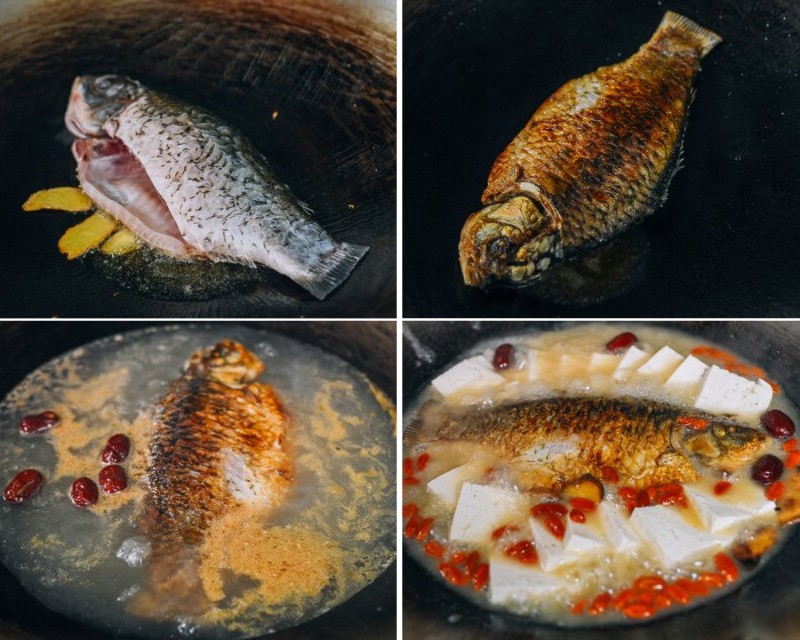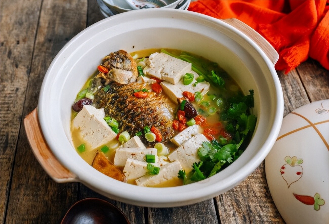 鲫鱼 1条、盐1/2小勺、姜4片、开水1.5L(大概7杯水)、黄酒2大勺、糖1/2小勺、红枣3颗、枸杞1大勺、豆腐400g(推荐嫩豆腐)、白胡椒粉1/2小勺、麻油 (可选)1/4小勺、葱花2根、香菜(可选)1大勺