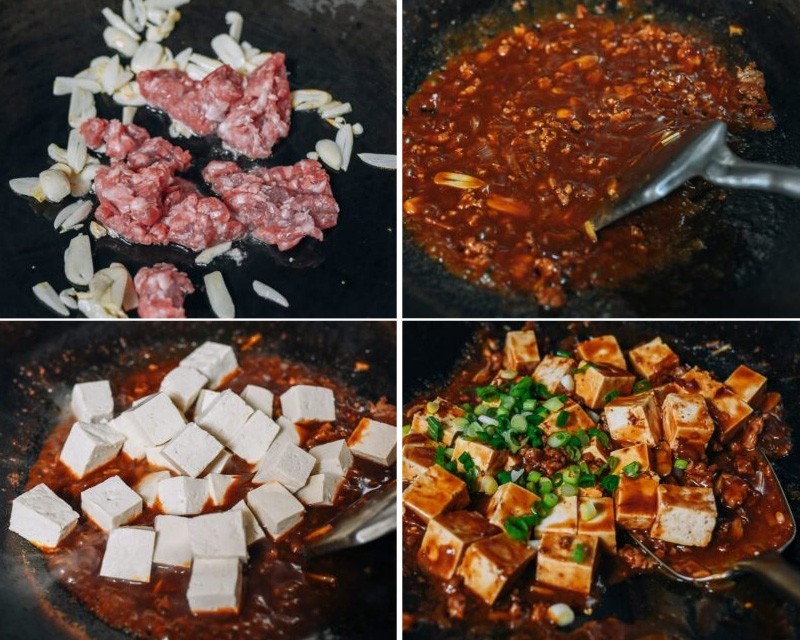 豆腐1盒 (400g)、猪绞肉 100g、大蒜 切片 10瓣、葱2根、料酒2大勺、蚝油1大勺、辣豆瓣酱1大勺、鸡汤(或水)360ml、白胡椒粉1/4小勺、糖1小勺、芝麻油1/2小勺、玉米淀粉1大勺 (与1大勺的水混合勾芡)