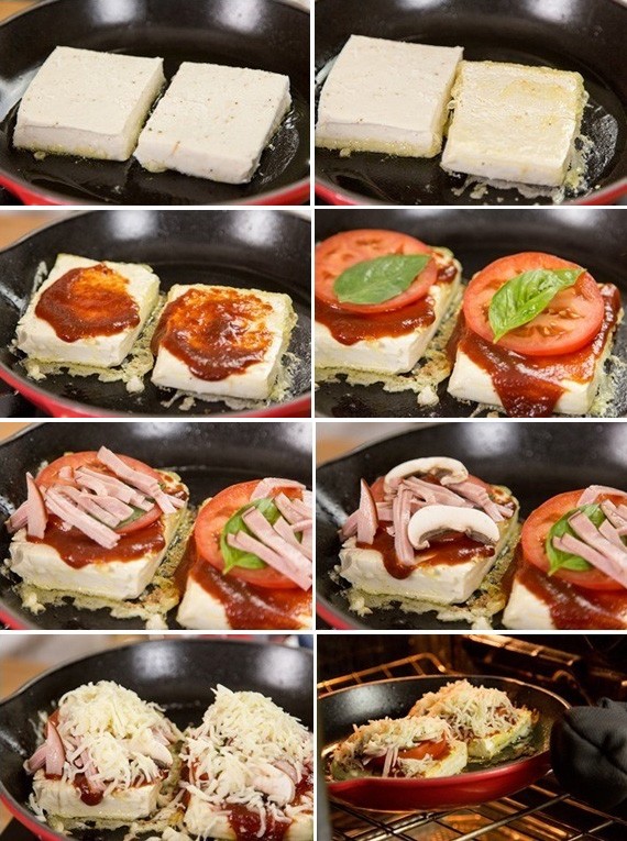 硬质豆腐1个、火腿3片、蘑菇2个、番茄1个、马铃薯淀粉或玉米淀粉 4大勺、盐1/4小勺、黑胡椒适量、番茄酱2-3大勺、罗勒叶 2-4片、马苏里拉奶酪 适量。