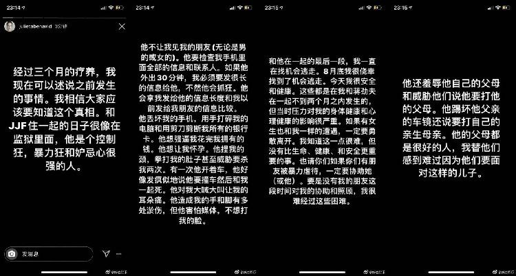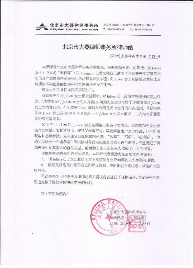 声明中指出,Julieta发文称自己遭到了蒋劲夫先生家暴等不实信息严重侵犯蒋劲夫合法权益,并要求其删除不实信息并向蒋劲夫赔礼道歉。