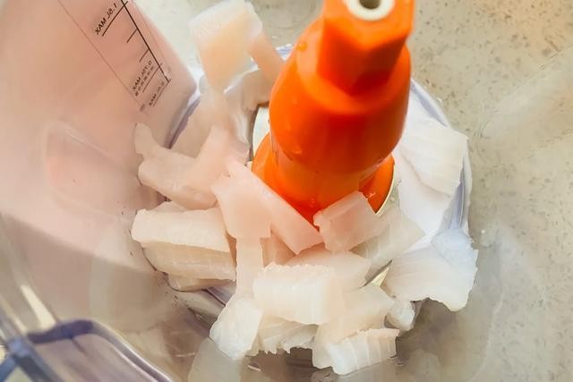 第一,鱼肉放入料理机打成鱼泥,没有就用手工刀背剁碎成泥。