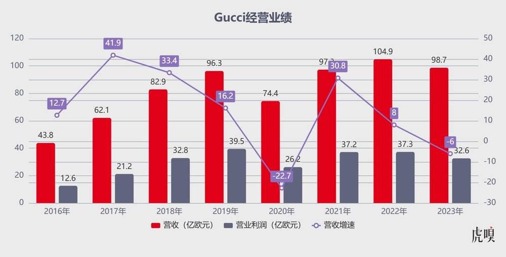 其实,早在 2023 年,Gucci 和整个开云集团的收入就已经开始下滑:Gucci 营收 98.7 亿欧元,同比下滑 6 个百分点;开云集团营收 195.7 亿欧元,同比下滑 4 个百分点。