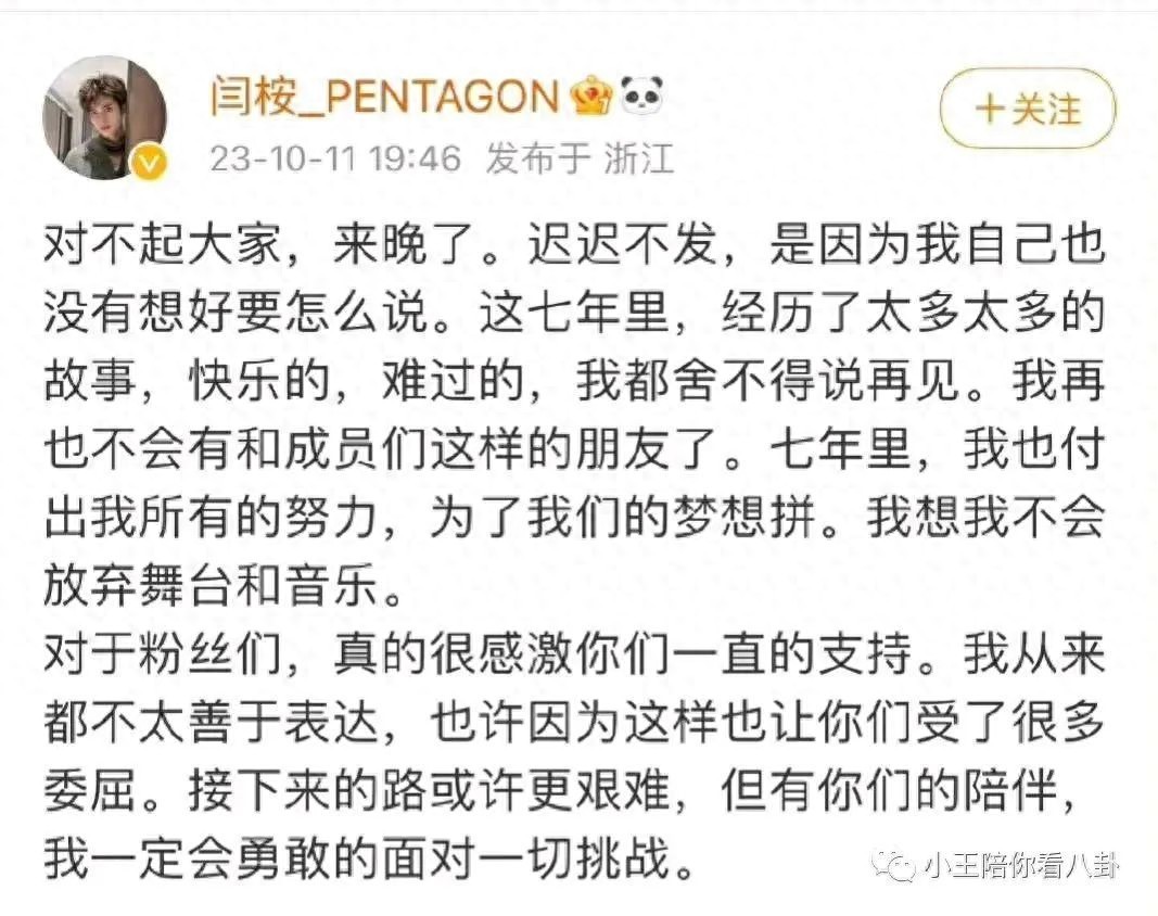 刚刚,韩娱cube旗下男团Pentagon成员闫桉发布了如下图的告别小作文,看起来还挺真情实感的,但评论区已经炸开了锅,不少粉丝当场脱粉,怒喷闫桉“白眼狼”,对不起粉丝这么多年的支持和喜欢。