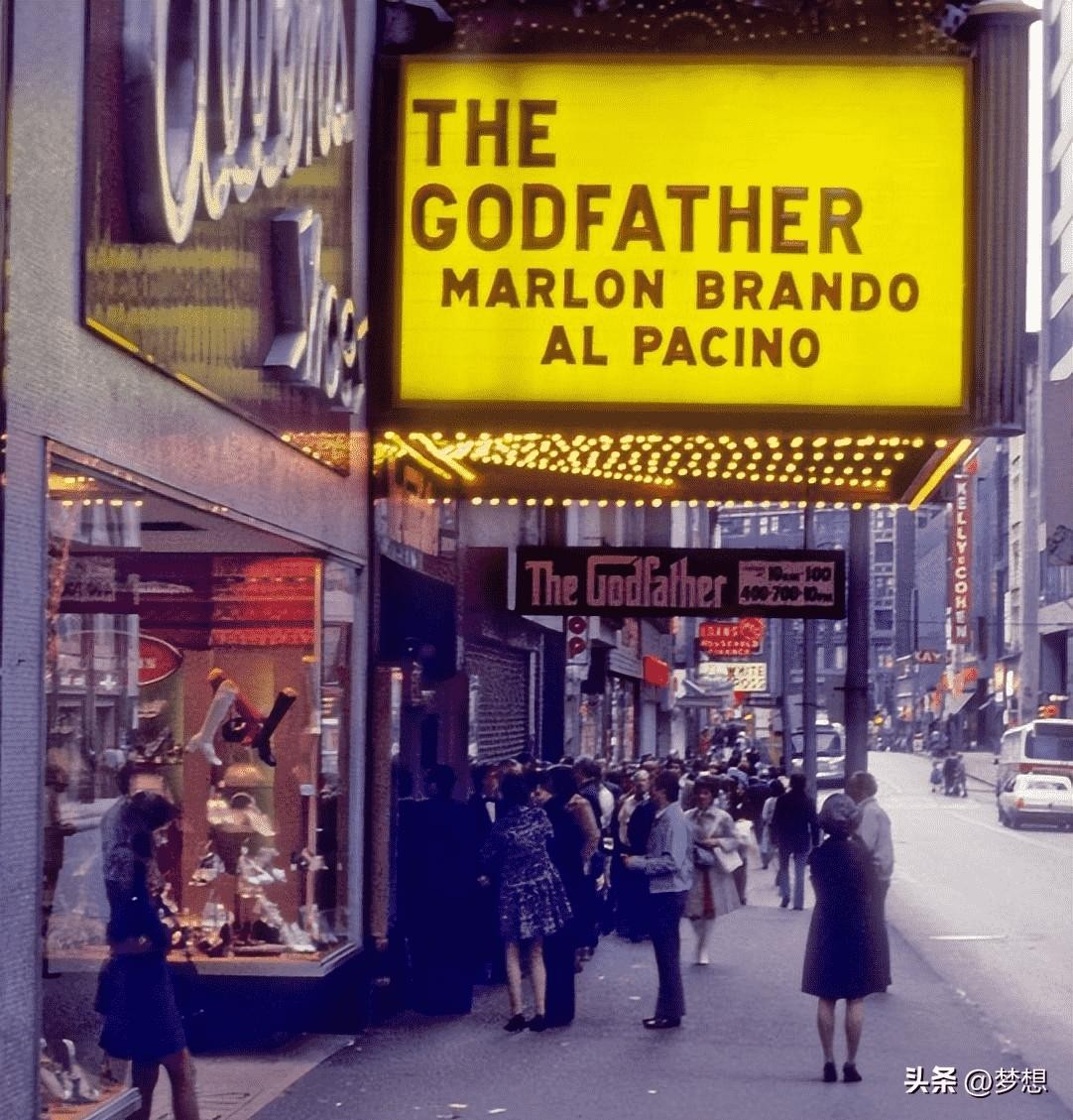 (29)1972年,在匹兹堡第五大道的华纳影院门口,一群人排起了长队,正在等待买票进入电影院。当时正是电影《教父》上映的时间点,为了能在电影院欣赏这部电影,人们宁愿排队,也不愿再多等一个星期。