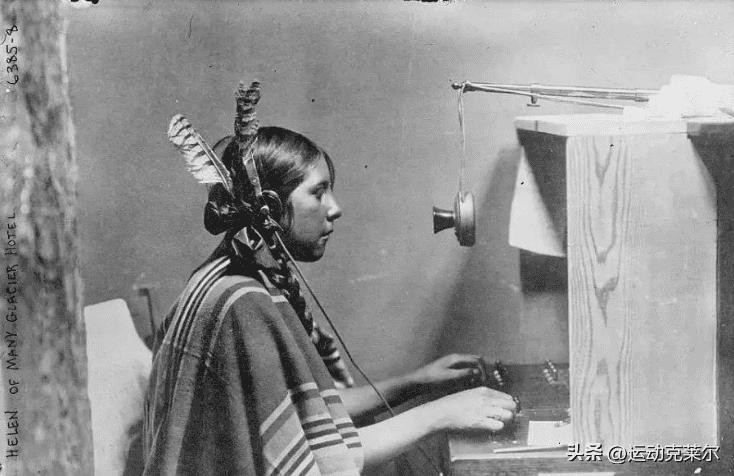 (16)1911年,一位印第安的苏族妇女,穿着印第安特有的服饰,坐在桌子的接线机前。她是美国一家酒店的工作人员,工作内容就是负责转接电话线,头上除了有一根羽毛之外,还戴着一副耳机。土著的服饰和工业时代的机器相结合,看起来很有冲突感。