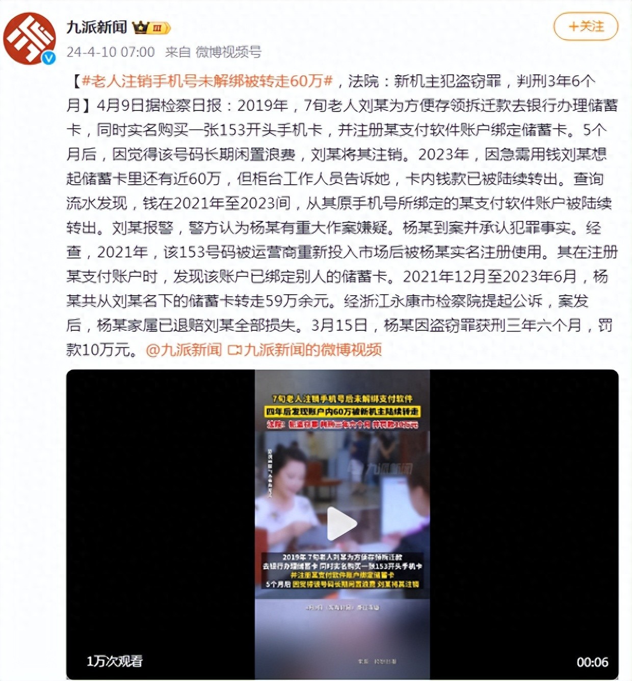 老人注销手机号未解绑被转走60万,法院:新机主犯盗窃罪,判刑3年6个月