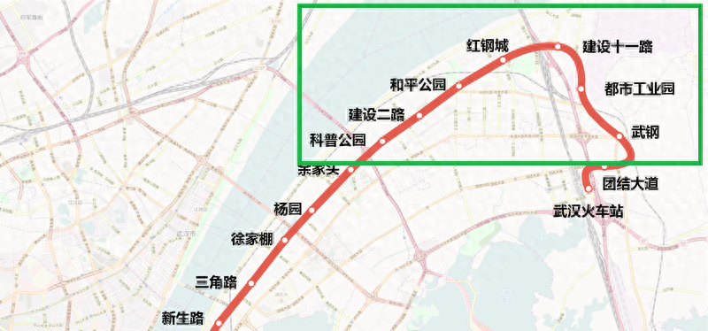 武汉地铁5号线继续向北经过红钢城站、建设十一路站之后,线路进行了转弯,并且在设置了都市工业园站。这个都市工业园站,属于一个不在任何大道上面的站点。