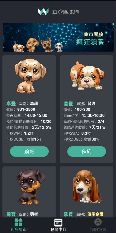 据报道,这是一款号称“高投资高收益的区块链游戏App”,自称公司总部在香港。玩家首先要在平台购买微分,然后预约领养对应时刻的虚拟宠物狗,就可获得高收益。如,宠物“卓登”价值901元至2500元,领养5天,可获得12.5%收益;宠物“普登”价值100元至300元,领养7天,可获得高达21%的收益。