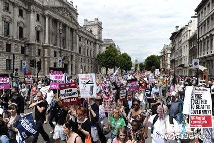 英国公共部门的工作人员在2011年11月30日为抗议政府的养老金制度改革计划举行了一天的大罢工,200多万人放下手头的工作,学校、医院、边检以及地方公共服务受到影响。