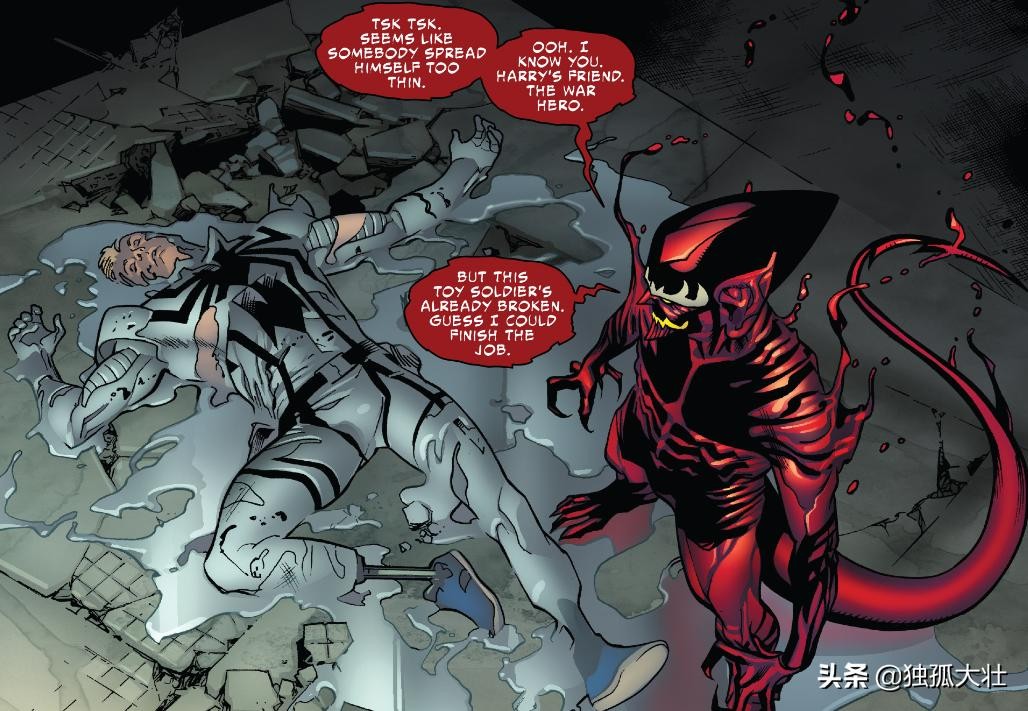 这段剧情要追溯到《神奇蜘蛛侠V4》,异种共生体Carnage附身于诺曼·奥斯本,让他从绿魔变成了“红魔”,而毒液的前任宿主闪电·汤姆森在这场危机中战死,但是诺曼并没有罢休,甚至还让Carnage附身了自己的孙子,也就是诺米·奥斯本。