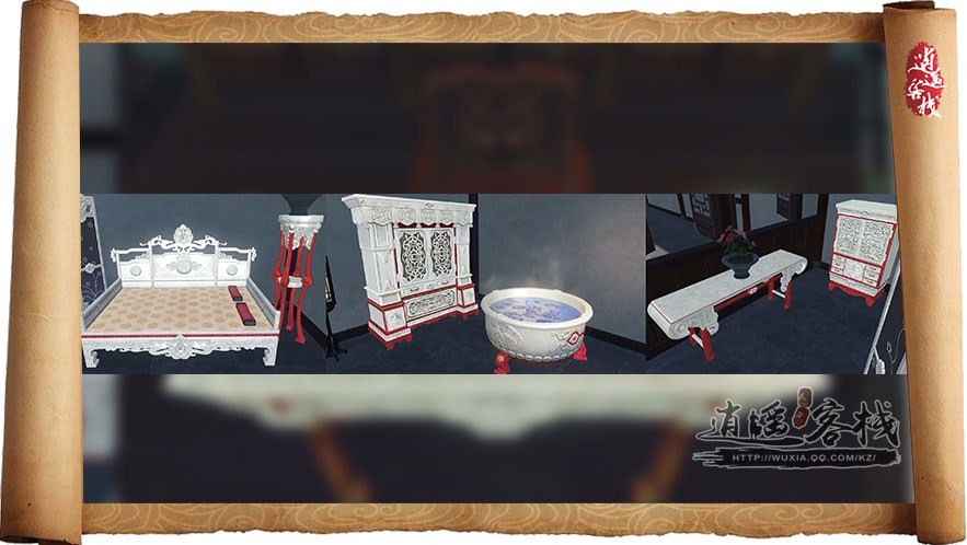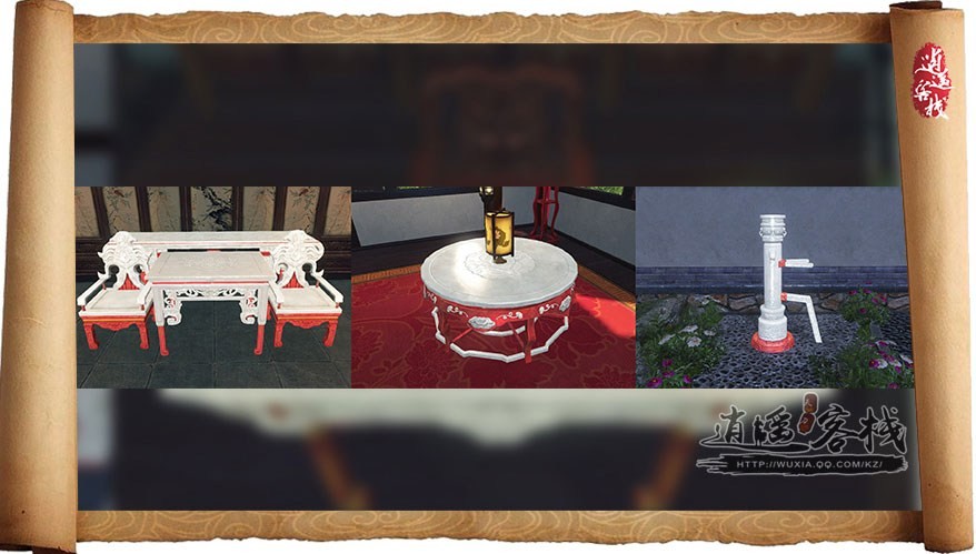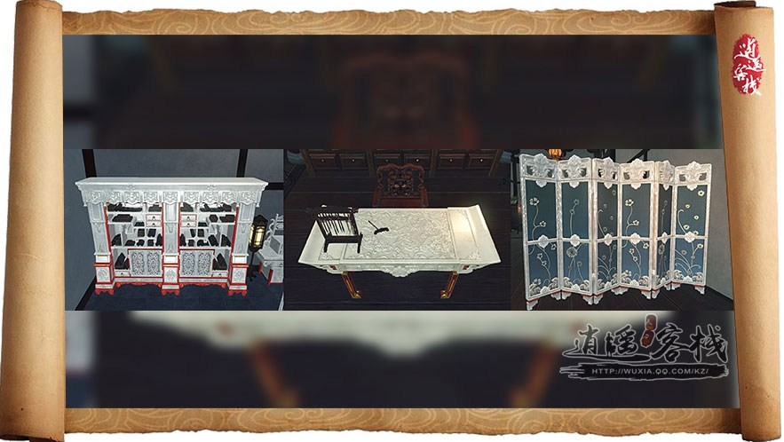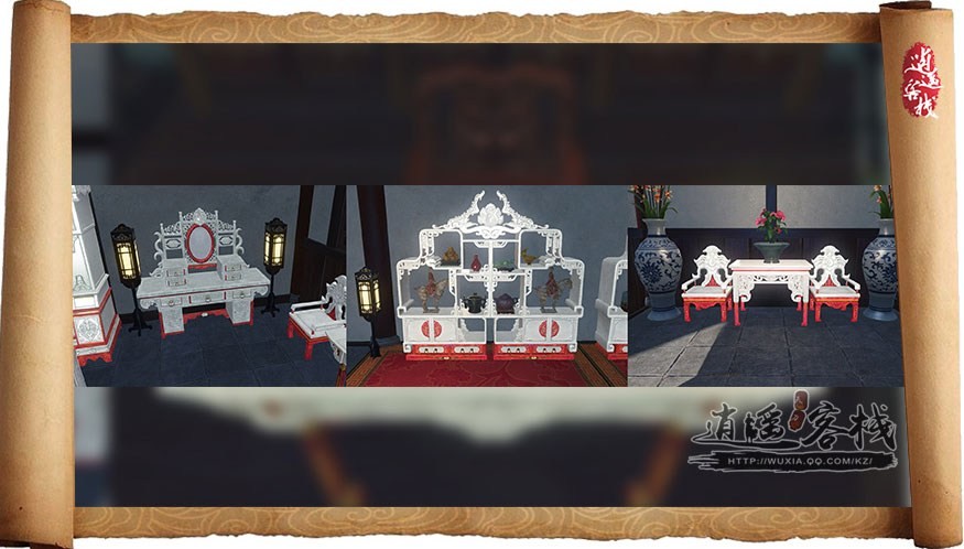 从左到右依次为:妆台·雪千寻、博古架·雪千寻、太师椅·雪千寻&方桌·雪千寻