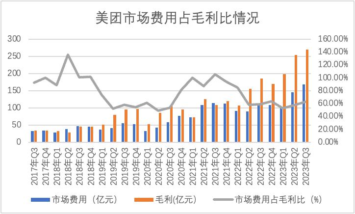 3)在用户培养期内,企业就要通过补贴等形式以提高获客效率,2023 年 Q3 美团市场费用占毛利比较之此前有所抬头。
