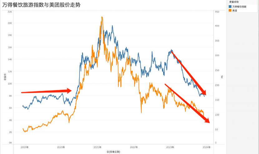 尽管身处 A 股的万得餐饮旅游指数与美团不在同一市场,但两条曲线仍然呈高度的一致性,值得注意的是,前者 2023 年缩水接近一半,与美团的市值收缩也属同一水平。