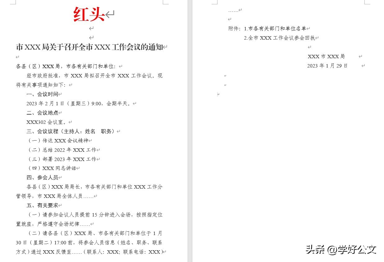 【解析】以上示例是市XXX局发布的会议通知。这篇会议通知要素齐全,文字简明。标题是完整要素的公文标题。正文没有讲述会议召开的目的,一句“经市政府批准”引入,用通知常用的过渡语“现将有关事项通知如下”引出通知事项。通知事项包含会议时间、会议地点、会议议程、参会人员、有关要求5个方面,通过附件的形式写明了参会单位名单,涵盖了会议的基本信息,让人看了一目了然。