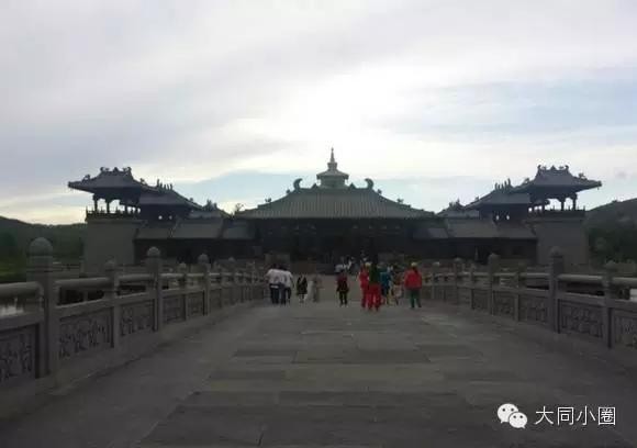 参观完陈列馆,就可以再乘电瓶车返回景区门口。到达以后,不要急着出去,还可以再参观一下刚进来时看到的灵岩寺(山堂水殿)。这里是近几年依据郦道元在《水经注》中对当年云冈美景的描述新修建的,很像江南地区东吴时的建筑,的确有山堂水殿,烟寺相望,林渊锦镜,缀目新眺的感觉。