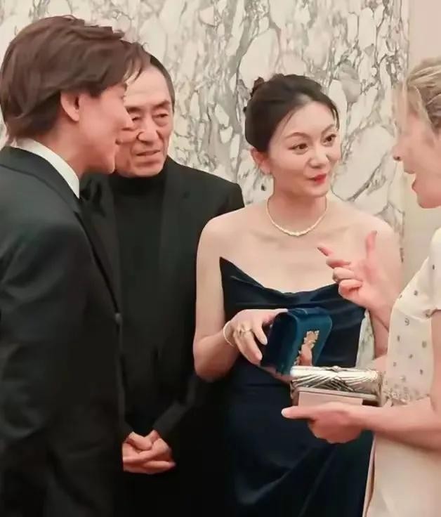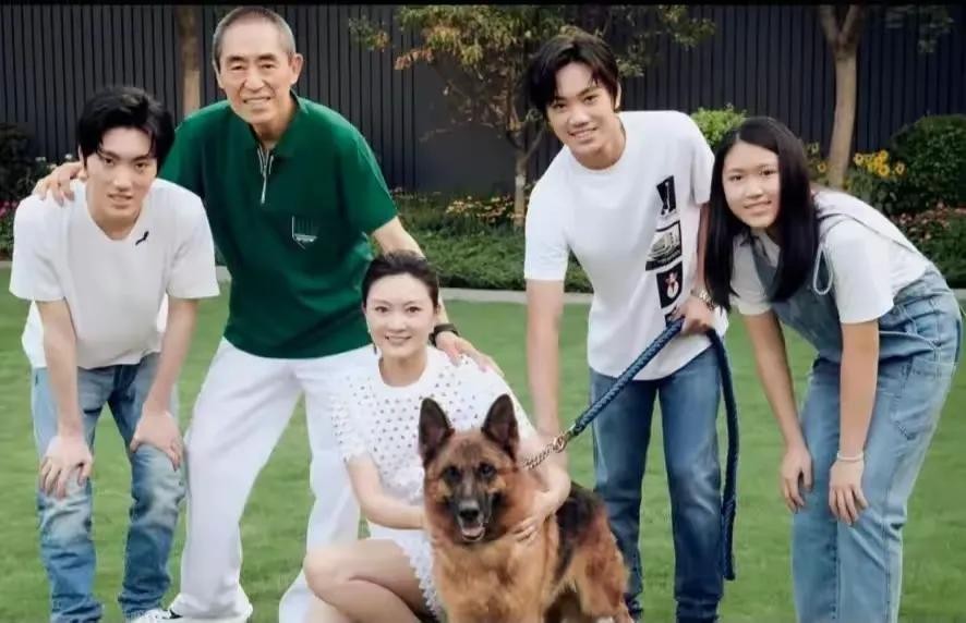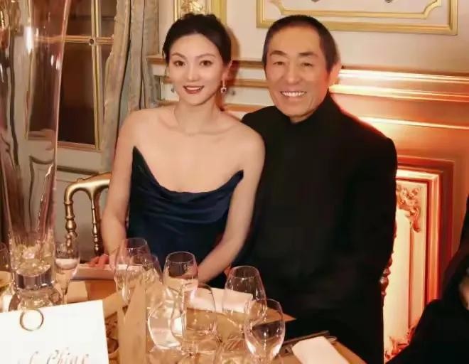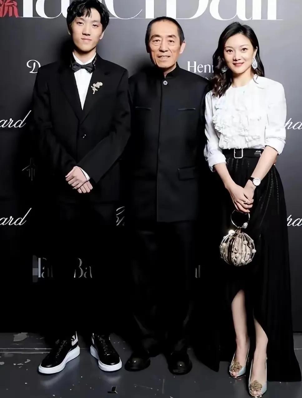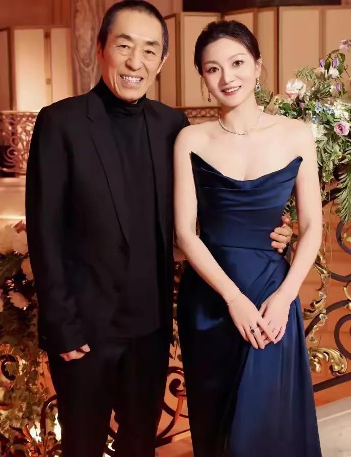 简单的珠宝点缀在她的脖颈、耳垂间,恰到好处地闪耀着光芒,像是夜空中闪烁的繁星,为她增添了几分神秘与高贵。她站在那里,仪态万千,笑容温婉,岁月似乎并未在她脸上留下太多痕迹,让人很难相信她已是三个孩子的母亲。旁边的张艺谋,虽已 74 岁,但精神矍铄,眼神中透着对妻子的宠溺与自豪。