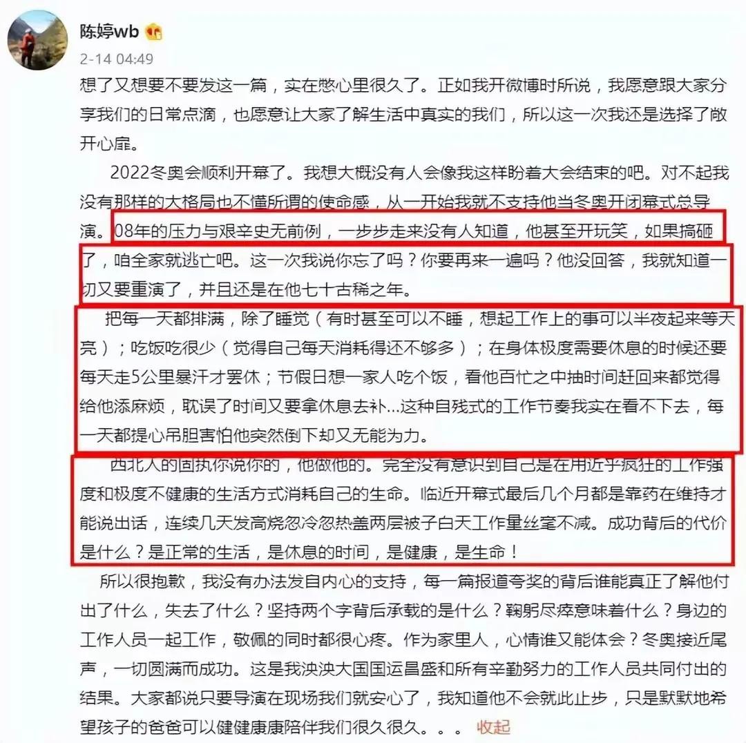 在北京冬奥会期间,情人节当天,陈婷在社交媒体上发文,字里行间满是对张艺谋的担心与忧虑。她写道:“看着他为了冬奥会如此拼命,我真的很心疼。他每天都工作到很晚,身体也越来越差,可他还是坚持着。我只希望他能多注意自己的身体,不要那么累了。”那文字,就像是一位妻子对丈夫最真挚的倾诉,充满了深情与爱意。从她的文字中,人们仿佛能看到她坐在家中,眉头紧皱,眼神中满是关切地等待张艺谋回家的画面。