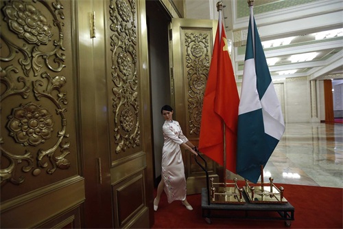 2013年7月10日北京人民大会堂,一名工作人员推著中国和尼日利亚国旗。