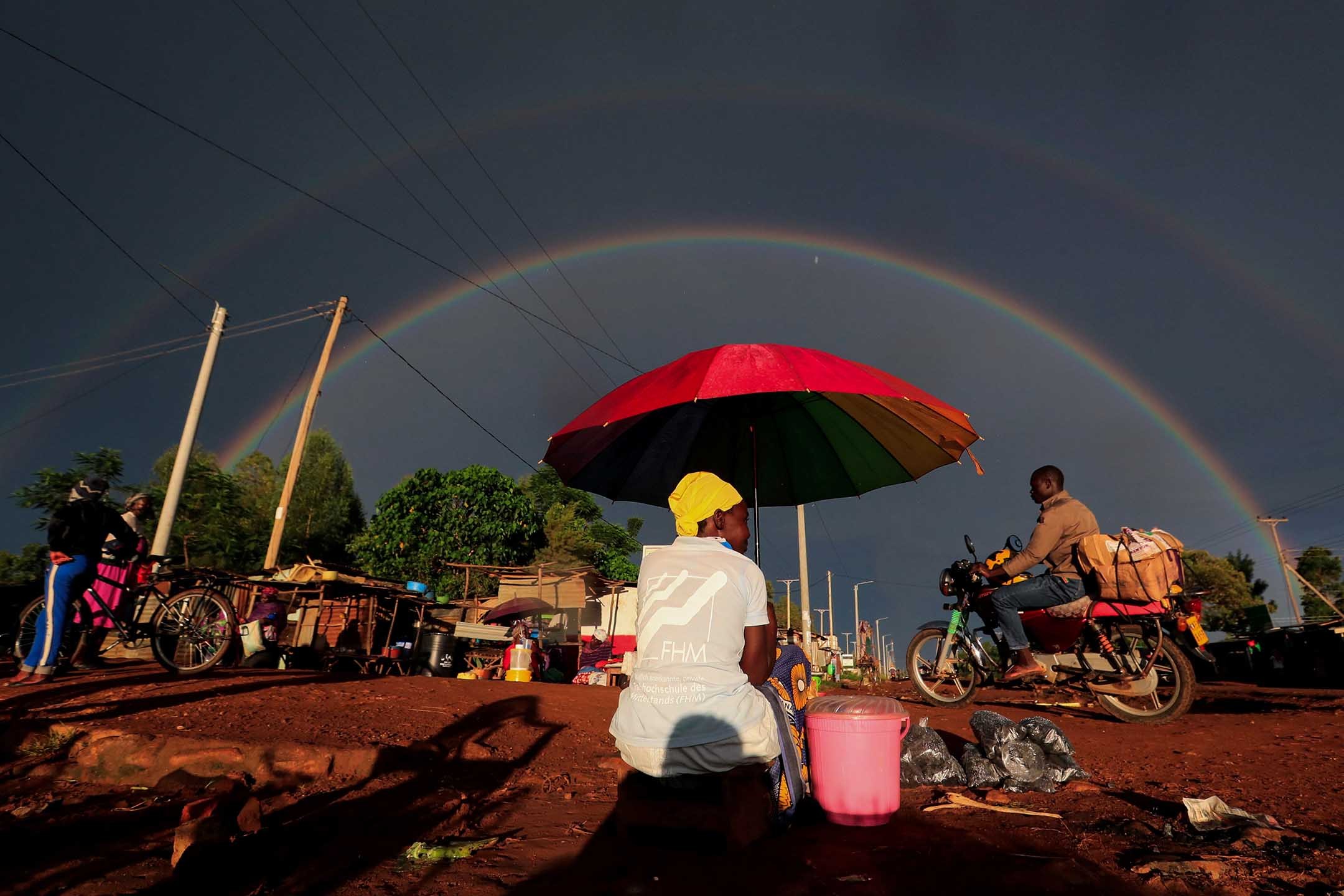 2020年5月3日肯尼亚,一名妇女手持雨伞并在路边卖零食。