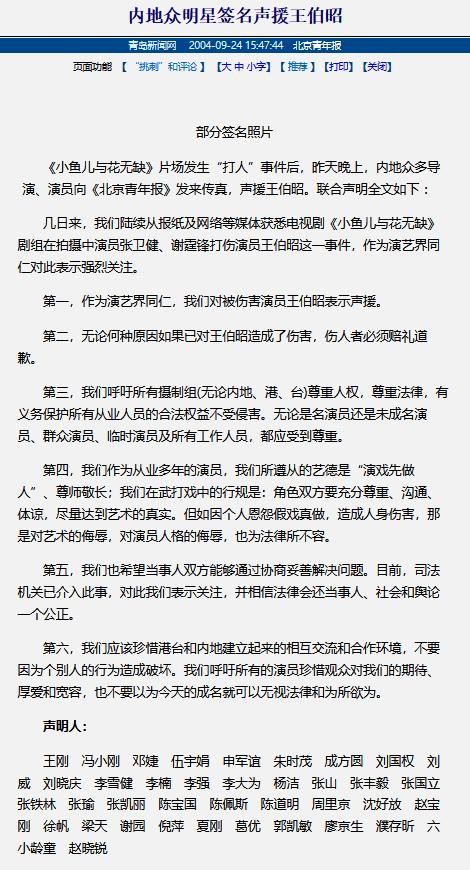 然而5天后,冯小刚、李雪健、陈道明等演员及导演,开始纷纷为王伯昭被打一事进行了声援。
