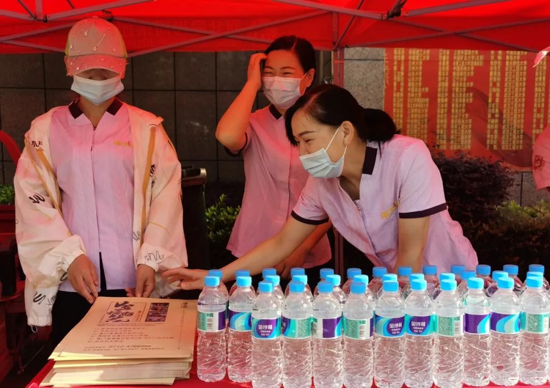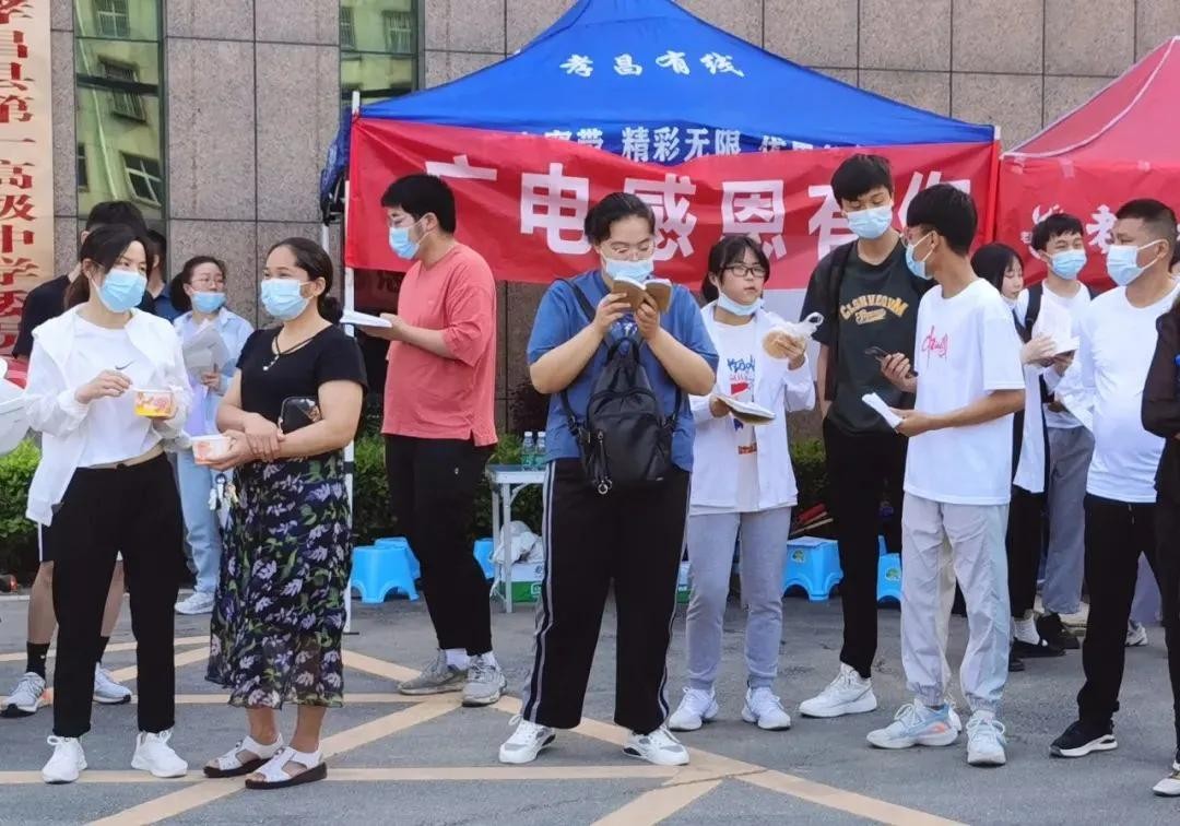 考场外有很多爱心志愿者,为考生和家长们准备了饮用水、绿豆汤,提供应急保障。