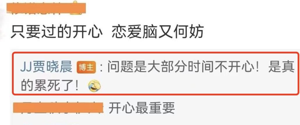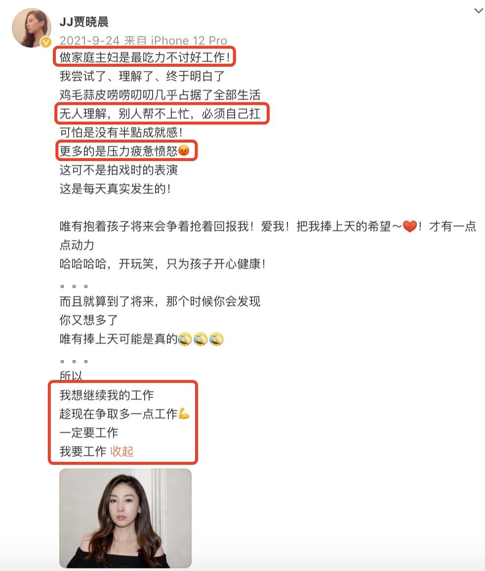 不过两人哪天真的官宣离婚了或许也不奇怪,因为贾晓晨曾经就多次发文抱怨过生活。她说做家庭主妇是最吃力不讨好的工作,无人理解,别人帮不上忙,必须自己扛。