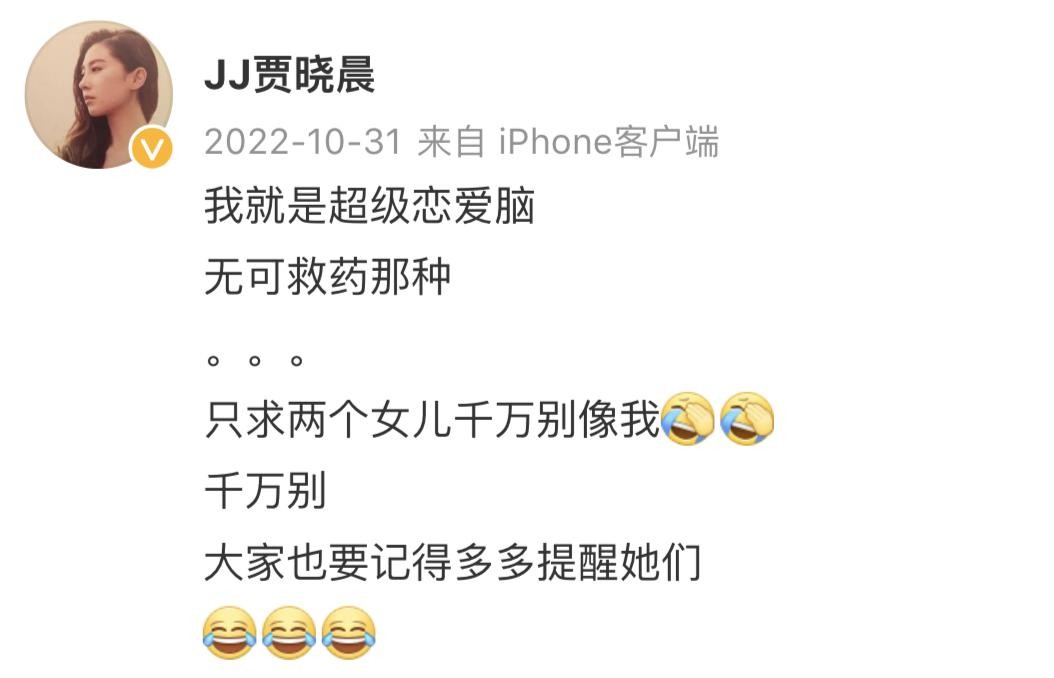 去年十月,贾晓晨也突然发文自称是恋爱脑。