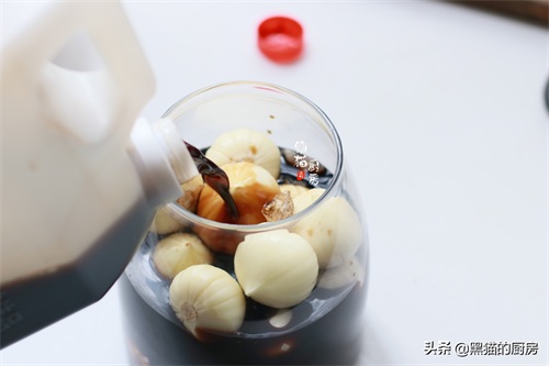 4.准备一个干净的玻璃罐子,无水无油擦干净了,然后把剥好的蒜头放入玻璃罐内,加入适量冰糖,倒入准备好的陈醋,陈醋要没过蒜头,最后滴上几滴白酒,这是第三步关键。