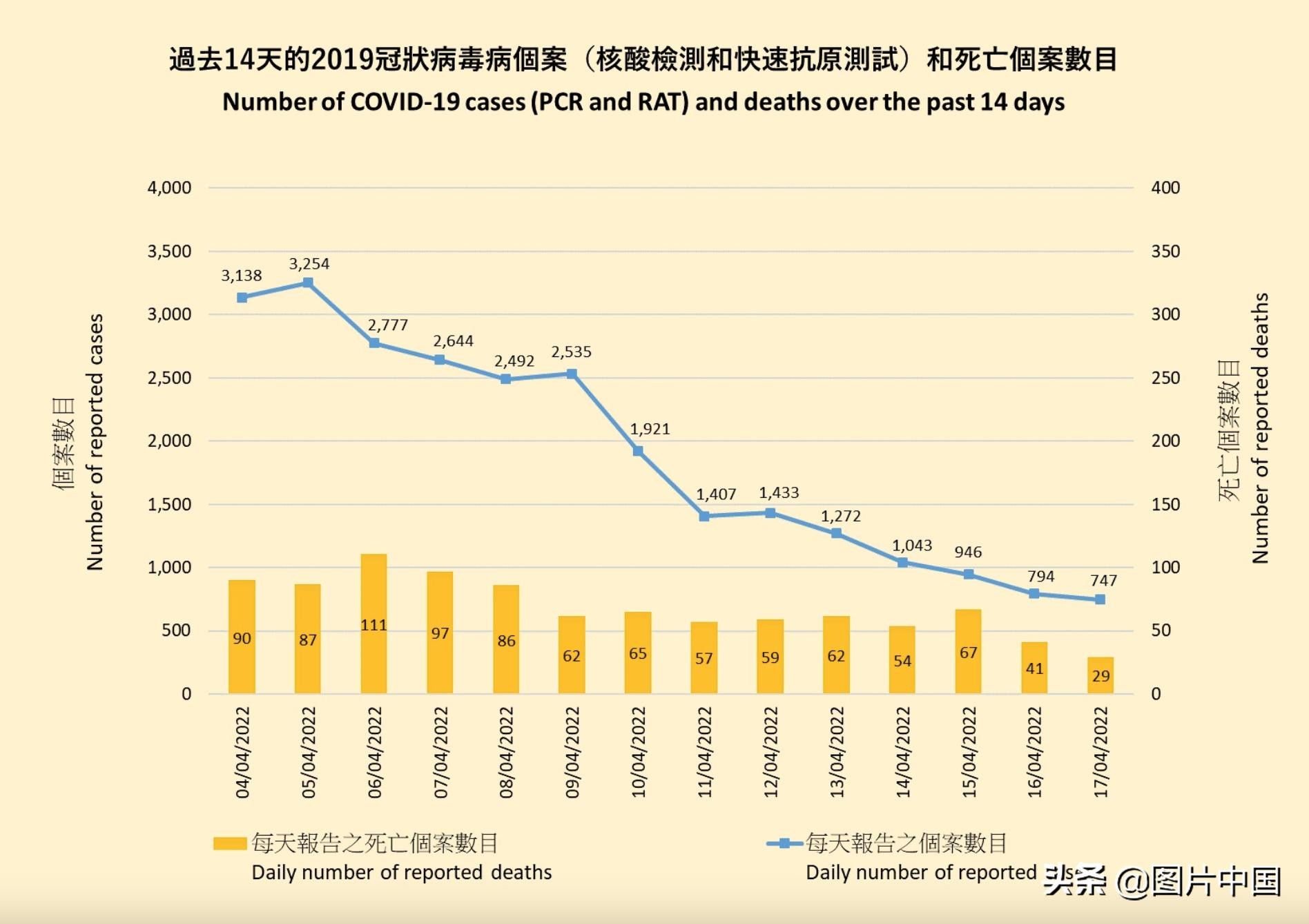 香港近14日新冠病毒检测阳性病例及死亡病例情况。图表显示,近3日,新增阳性病例已经不足千例。