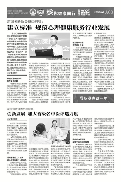 河南省政协委员、洛阳市第五人民医院院长李自强告诉记者,今年河南省两会,他带来了一份“关于推进河南省心理健康服务行业规范高质量发展”的提案,旨在全面提升河南省心理健康服务的专业性、规范性和可及性,为民众提供更优质、更可靠的心理健康服务。
