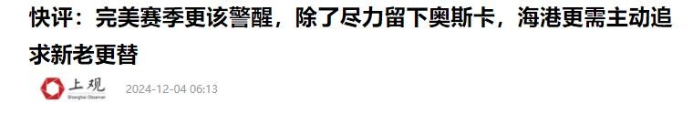 信息来源:上观新闻2024-12-4 快评:完美赛季更该警醒,除了尽力留下奥斯卡,海港更需主动追求新老更替