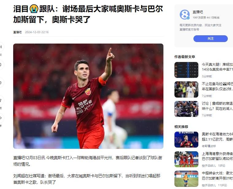 尽管比赛结果不尽如人意,但奥斯卡的表现和赛后的情感流露,无疑给了球迷们一个难忘的告别。