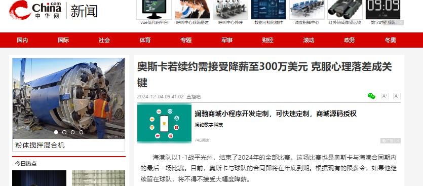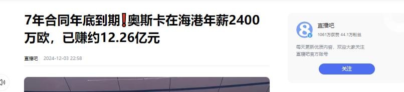 信息来源:直播吧2024-12-03 7年合同年底到期!奥斯卡在海港年薪2400万欧,已赚约12.26亿元