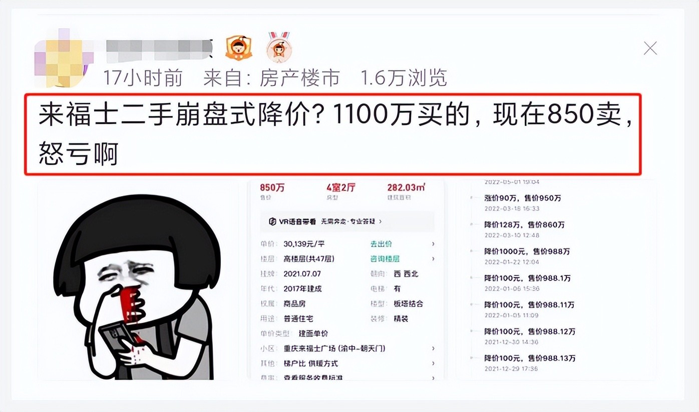 最近,位于重庆朝天门的著名地标楼盘来福士广场,二手房价崩盘的消息在网上刷屏了!