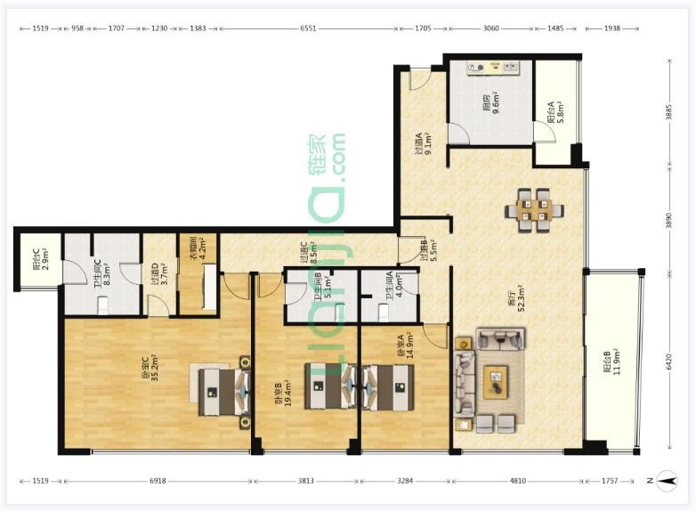 唯一觉得有点遗憾的是,这套建面282平的房子,居然只是三房的格局,其中两个卫生间还是暗卫,也不是南北通透的格局。