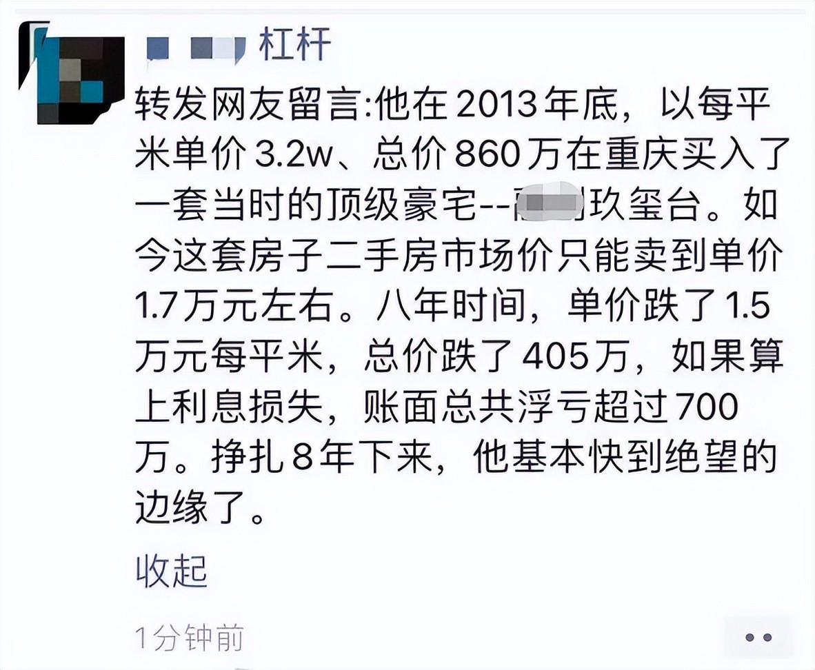 无独有偶,这两天又有网友爆料,其在南滨路860万高价买入的某顶级豪宅,单价从3.2万跌到了1.7万,总计亏掉了405万。