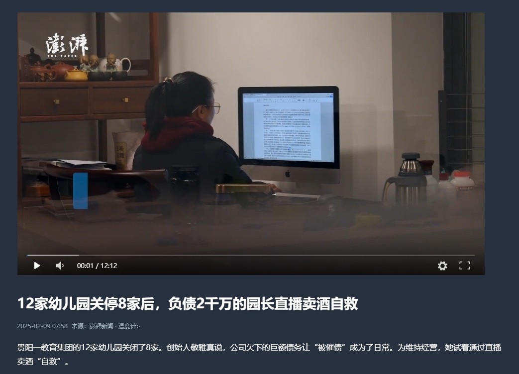 出生人口的短暂反弹,其实也并没能阻止事情向坏的方向发展。2月9日,澎湃新闻报道,贵阳一教育集团的12家幼儿园关闭了8家,负债2千万的园长直播卖酒自救,这是出生人口断崖式下跌引发全国幼儿园关停潮的连锁反应的一个缩影,2024年,全国有1.5万家幼儿园关闭。2025年起,将有近百万幼儿园教师陆续失业,约占目前教师总人数的30%,若未来出生人口持续减少,这一比例可能升至60%左右。这两年,网络上幼师转行送外卖、做直播已成普遍现象。