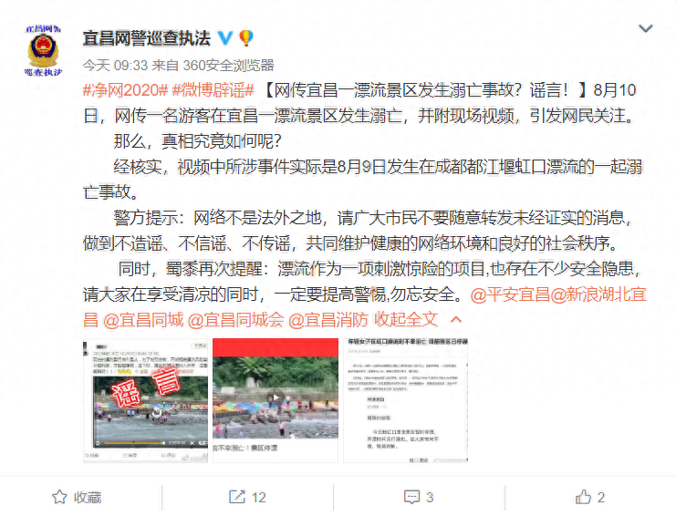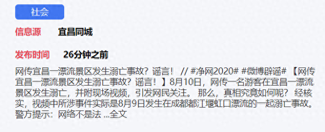 AI识谣系统在经过智能收集分析网络讯息后获知,今日09时33分许,湖北省宜昌市公安局网安支队即通过其官方微博“宜昌网警巡查执法”针对上述传闻进行了辟谣:“网传宜昌一漂流景区发生溺亡事故?谣言!”