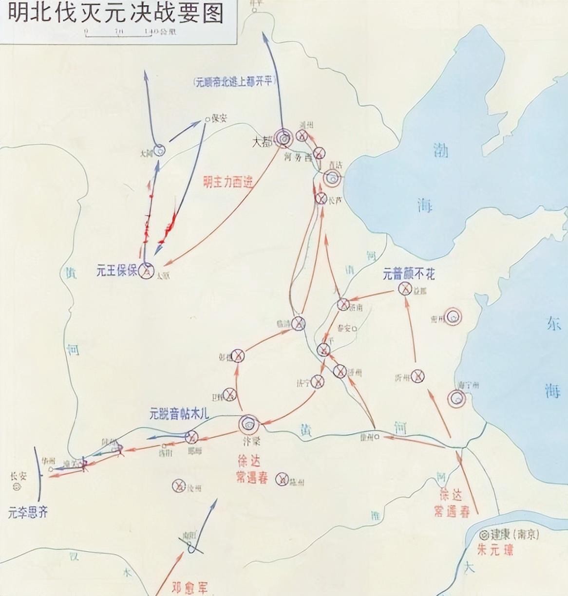 徐达北伐路线图。(本文由头条作者泊东原创)