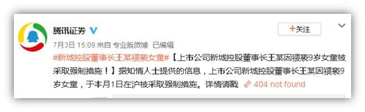 ·7月3日15时许,@新民周刊、@腾讯证券相继发布消息称:“上市公司新城控股董事长王某因猥亵9岁女童,于本月1日在沪被采取强制措施。”