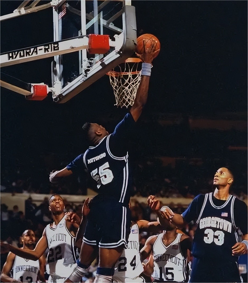 随着时间的推移,穆托姆博在乔治城大学的表现越来越好,和阿隆佐莫宁一起,他俩筑起了乔治城大学的禁飞区,曾经在一场大学比赛中,穆托姆博送出了恐怖的12次封盖,创造了队史记录。