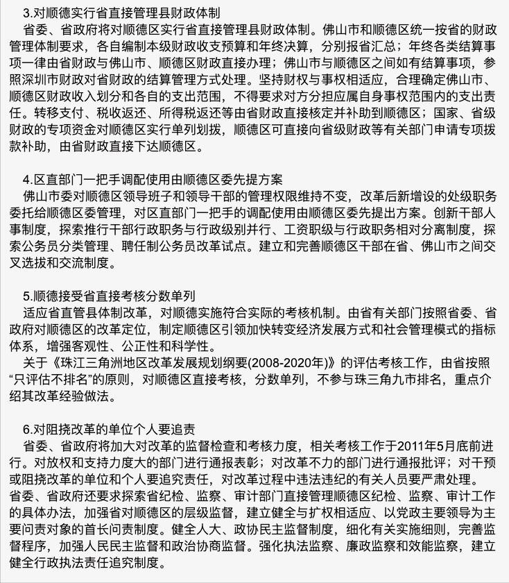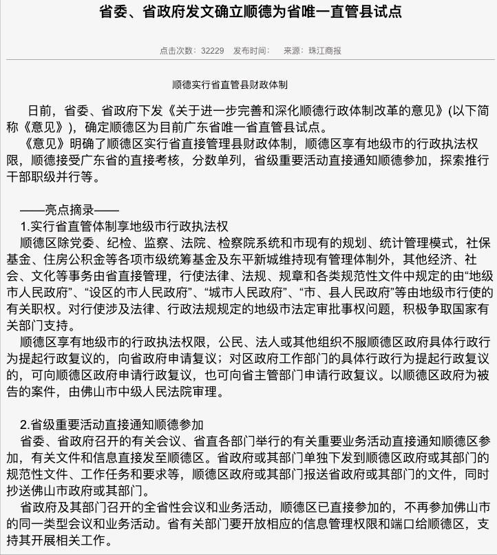 紧接着又过了两年,2011年初,广东省印发《关于进一步完善和深化顺德行政体制改革的意见》,确定顺德区为省直管县唯一试点