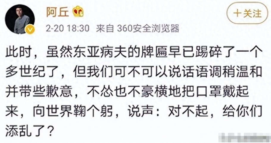 阿丘的原话是这样的:“此时,东亚病夫的牌匾早已踢碎了一个多世纪了,但我们可不可以说话语调稍温和并带些歉意,不怂也不豪横地把口罩戴起来,向世界鞠个躬,说一声对不起,给你们添乱了。”