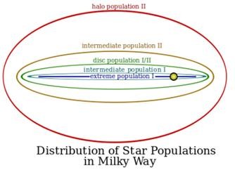我们可以粗略地把银河系中的恒星分为两类。年代久远且重元素很少的恒星被称为星族Ⅱ,存在于银晕和球状星团中。星族Ⅰ比星族Ⅱ拥有更重的元素,以及连续的金属丰度和稳定的轨道形状,它们通常更年轻,排列在银盘中,尤其集中在旋臂中。