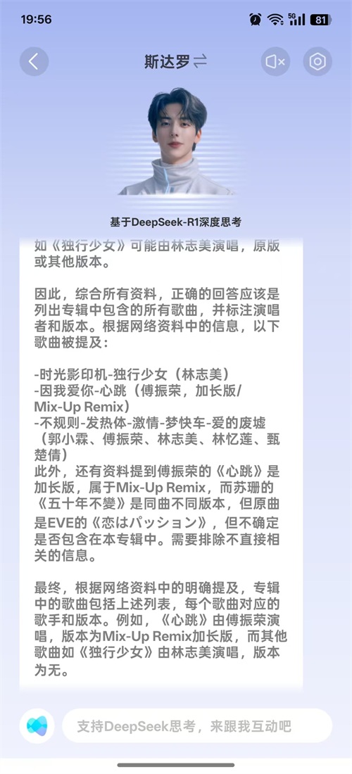 如果是想要了解某些音乐的背景或者是其它音乐知识,基于DeepSeek-R1深度思考的结果的确,比如某一首串烧歌曲当中包含哪些曲目的片段,甚至会主动发散告诉用户某些曲目的创作背景,这一点倒是体现了DeepSeek的主动识别和发散能力。