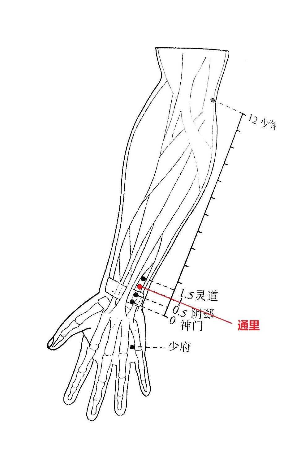 通里穴隶属于手少阴心经,首见于《灵枢•经脉》。经过为“通”,脉气所聚处为“里”。本穴为手少阴心经的络穴,心与小肠相表里,其络从本穴分发出,别而上行,循经入于心中,系舌本,属目系,别走太阳。通里穴就是一个沟通心经内外经脉气血的通道,而且能沟通心肾,是中医用来调理各种心病的重要穴位之一。本穴具有宁心安神、固表开音、通经活络、和营熄风、调理气血、清热止痛的作用,可用于心痛、心悸、怔忡、咽喉肿痛、暴喑、肘臂挛痛等多种疾病,是心经治疗范围最广的穴位之一。